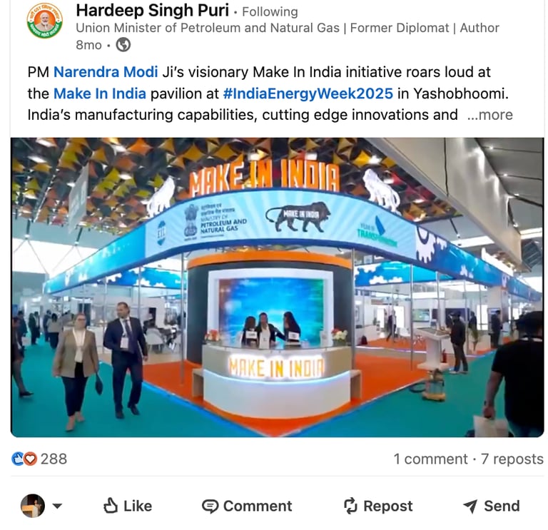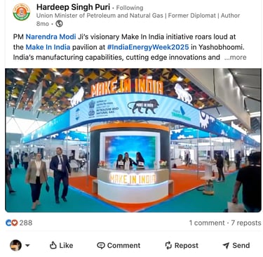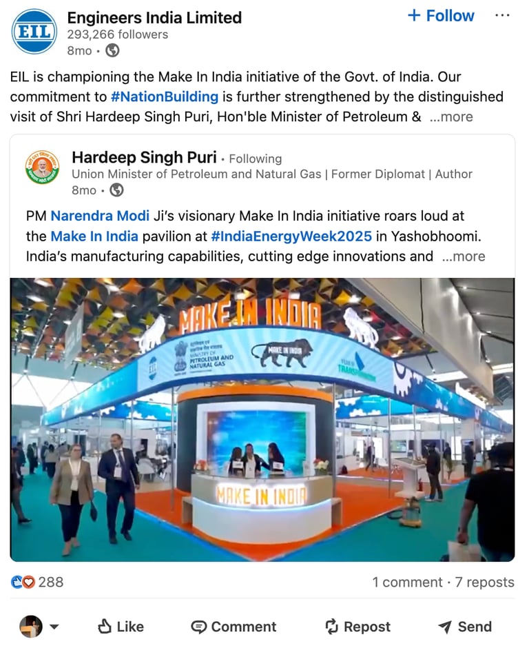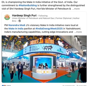 Union Minister of Petroleum and Natural Gas posted our video on his official Twitter & LinkedIn page. That skyrocketed the image of EIL and worked as a proof to showcase the incredible showcase of the Make in India Pavillion at the India Energy Week.
