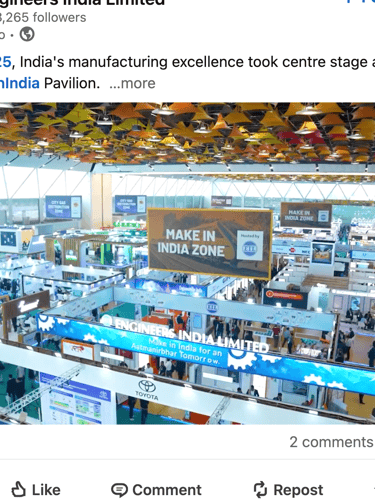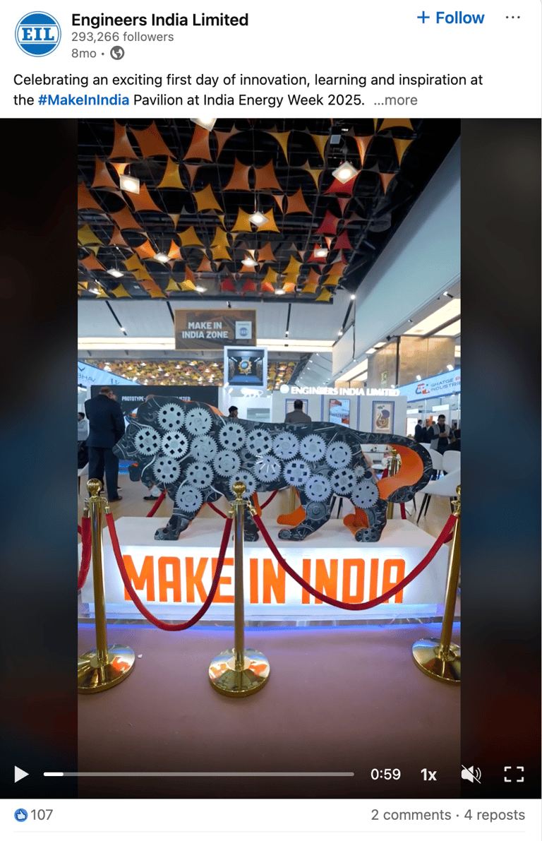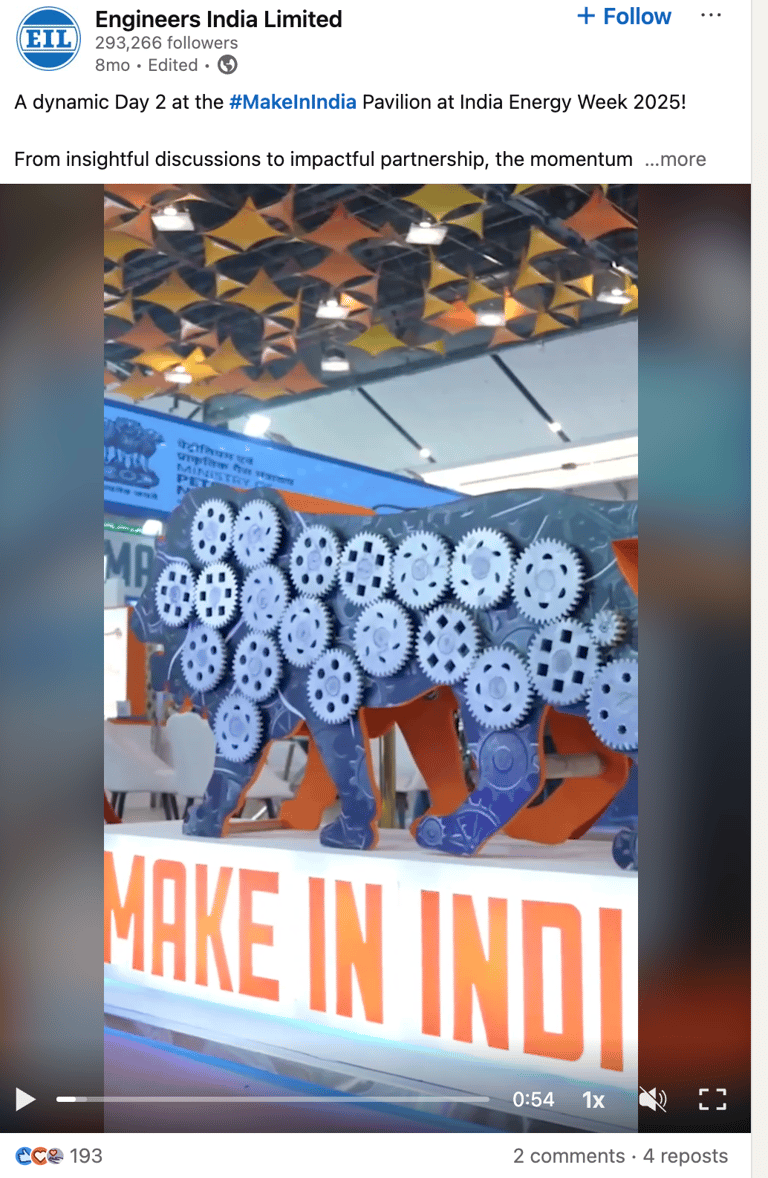 Engineers India Limited (EIL) is a premier engineering consultancy and EPC company under the Ministry of Petroleum & Natural Gas, Government of India, with over 293,000 LinkedIn followers. As champions of India's Make in India initiative, EIL required compelling visual storytelling to showcase their Make in India pavilion at India Energy Week 2025